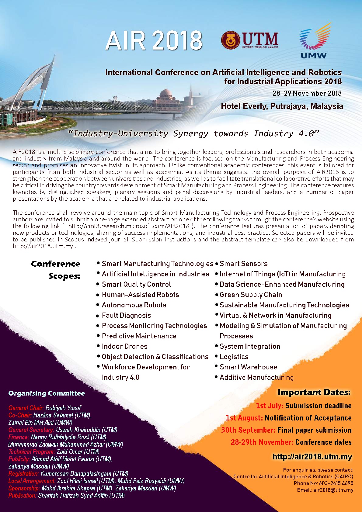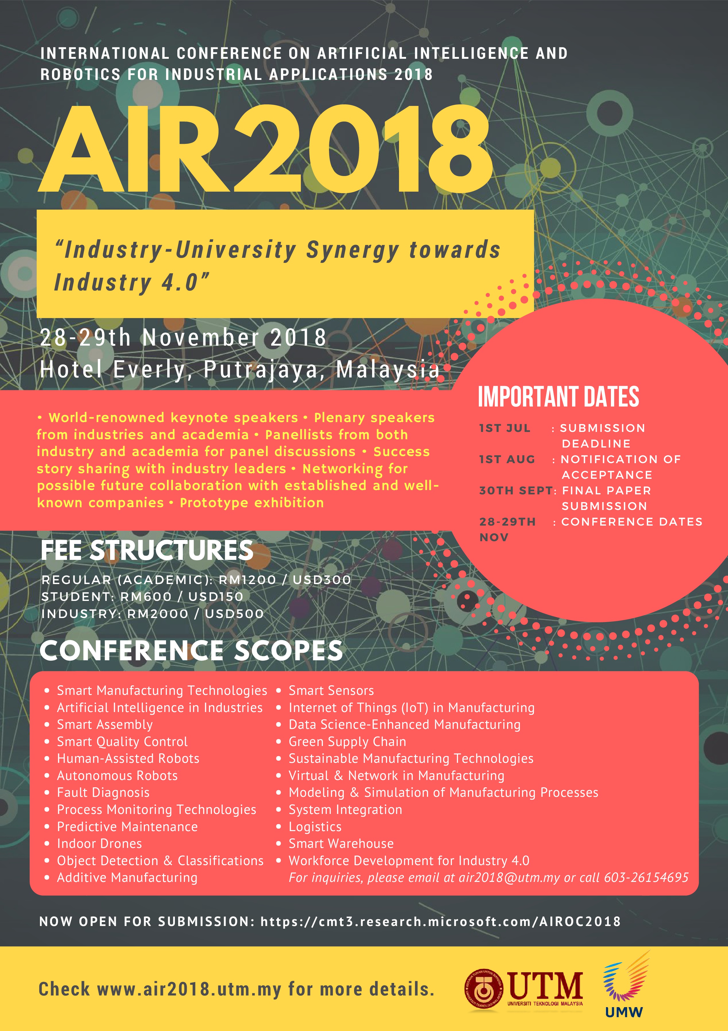 For further enquiry, do not hesitate to contact us at +603-26154695 or email us at air2018@utm.my. We are looking forward for your positive reply. Attached is the call for paper for the conference.