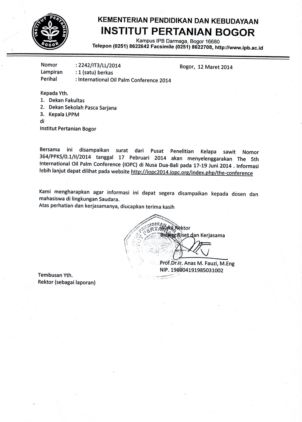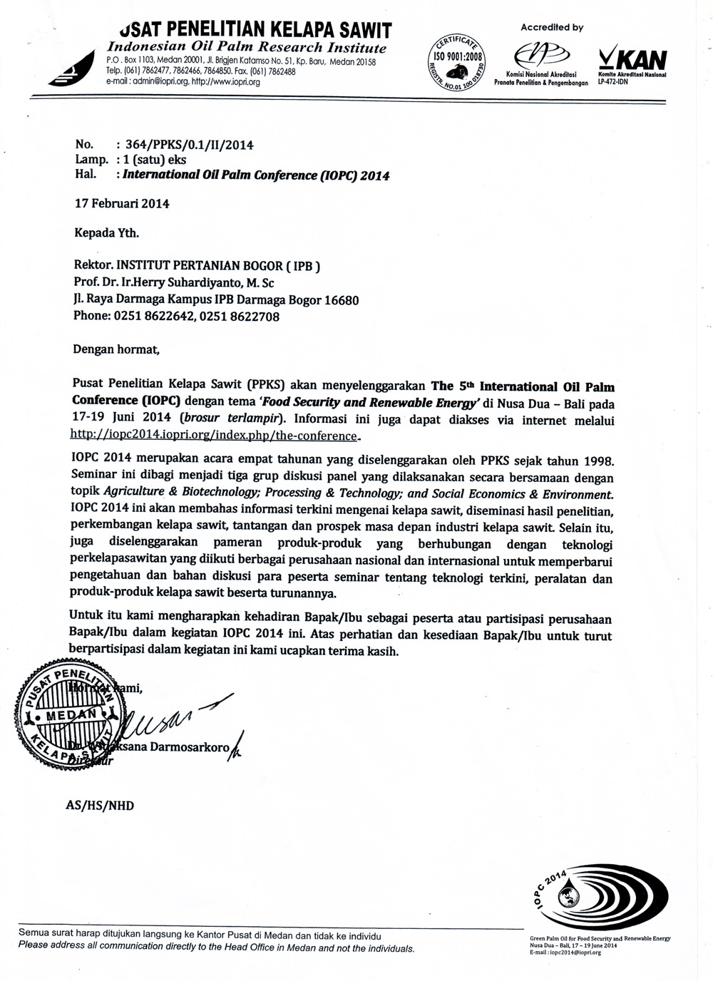 Berikut disampaikan informasi dari Pusat Penelitian Kelapa Sawit untuk diketahui Dosen/Peneliti IPB. TTD LPPM IPB ———————————————— Pusat Penelitian Kelapa Sawit (PPKS) akan menyelenggarakan “The 5th International Oil Palm Conference (IOPC) ” dengan tema “Food Security and Renewable Energy” di Nusa Dua-Bali pada 17-19 Juni 2014, Informasi ini lebih lanjut dapat dilihat pada website http://iopc2014.iopri.org/index.php/the-conference