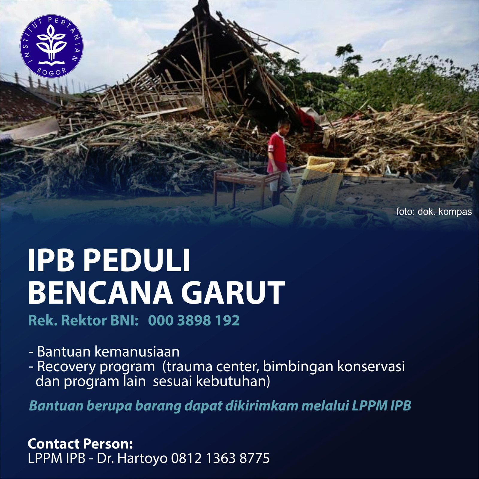 Bantuan dalam bentuk uang dapat dikirimkan langsung ke Rek. Rektor BNI 000 3898 192. Bantuan berupa barang dapat dikirimkan melalui LPPM IPB, Gedung Andi Hakim Nasution, Lantai 5, Kampus IPB Dramaga Bogor, 16680.