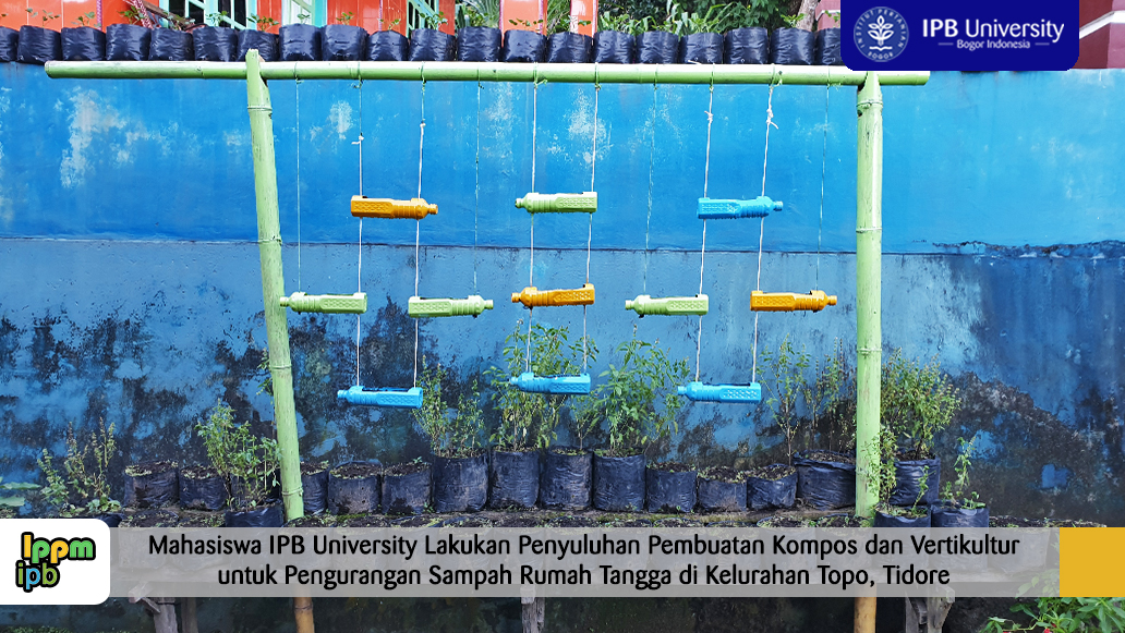 Mahasiswa IPB University yang sedang melakukan Kuliah Kerja Nyata Kebangsaan (KKN-K) 2019 bersama 7 mahasiswa dari universitas lainnya berikan sosialisasi dan penyuluhan langsung pembuatan kompos dan pembuatan vertikultur kepada masyarakat kelurahan Topo, Tidore, Maluku Utara (11/8). Kegiatan tersebut dilakukan untuk mengurangi sampah rumah tangga yang dihasilkan dari tiap warga di kelurahan topo. Sampah organik yang dihasilkan dari rumah warga diolah menjadi pupuk kompos sedangkan sampah anorganik yang berupa botol bekas diolah menjadi media vertikultur.