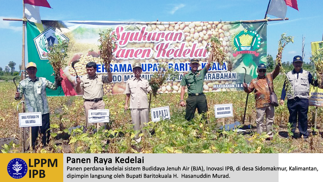 Panen perdana kedelai sistem Budidaya Jenuh Air (BJA), Inovasi IPB, di desa Sidomakmur, Kalimantan pada tanggal 18 Agustus 2016 dipimpin langsung oleh Bupati Baritokuala H. Hasanuddin Murad. Saat ini kedelai merupakan komoditi impor untuk kabupaten Batola. Kedepan swasembada kedelai sangat dimungkinkan. Dihadiri oleh Prof. Dr. drh. Agik Suprayogi, M.Sc., Agr sebagai Wakil Bidang Penelitian LPPM IPB, Prof. Dr. Ir. Kudang Boro Seminar, M. Sc. sebagai Dekan Fakultas Teknologi Pertanian IPB, Peneliti dan Ahli Kedelai Prof Dr MemenSurahman, M.Sc., Agr., Prof. Dr. Ir. Satriyas Ilyas, MS., Bapak Bonjok Istiaji, SP., M.Si. Turut hadir pula Dandim 1005/Marabahan Letkol ARH Irwan Setiawan dan anggota DPRD Batola Rahmadian Noor.