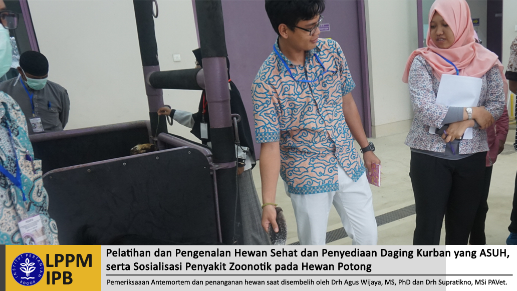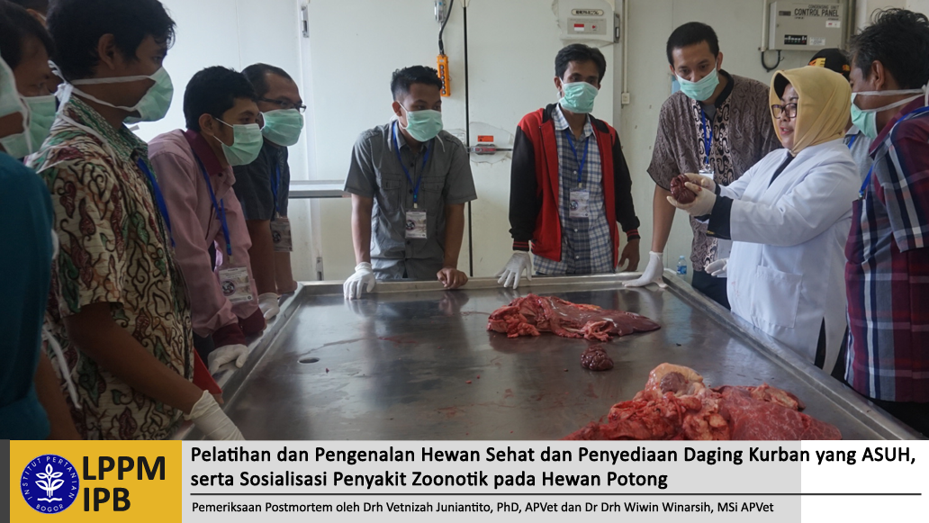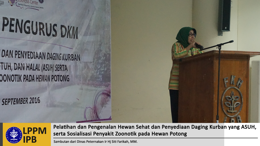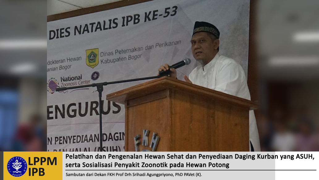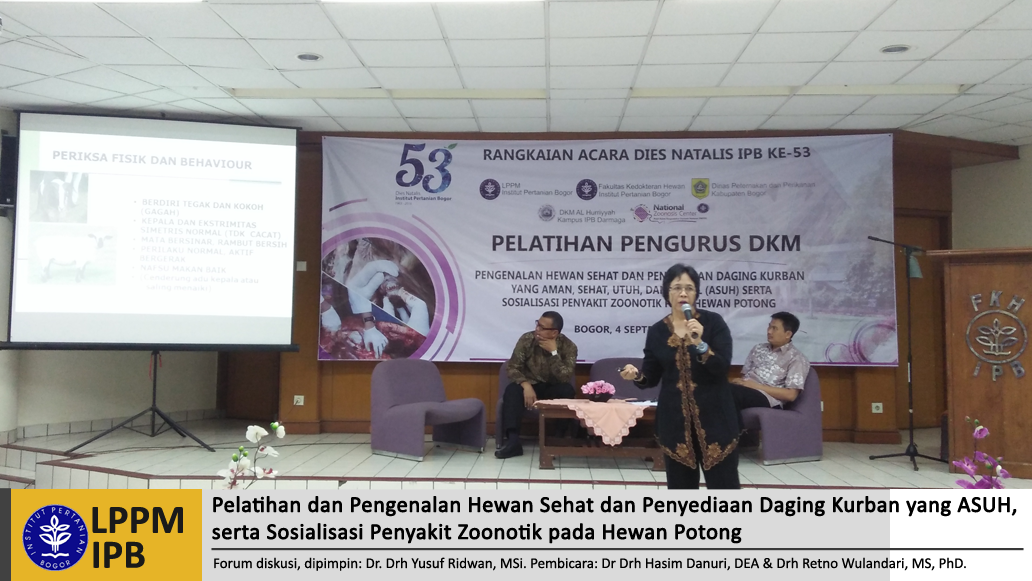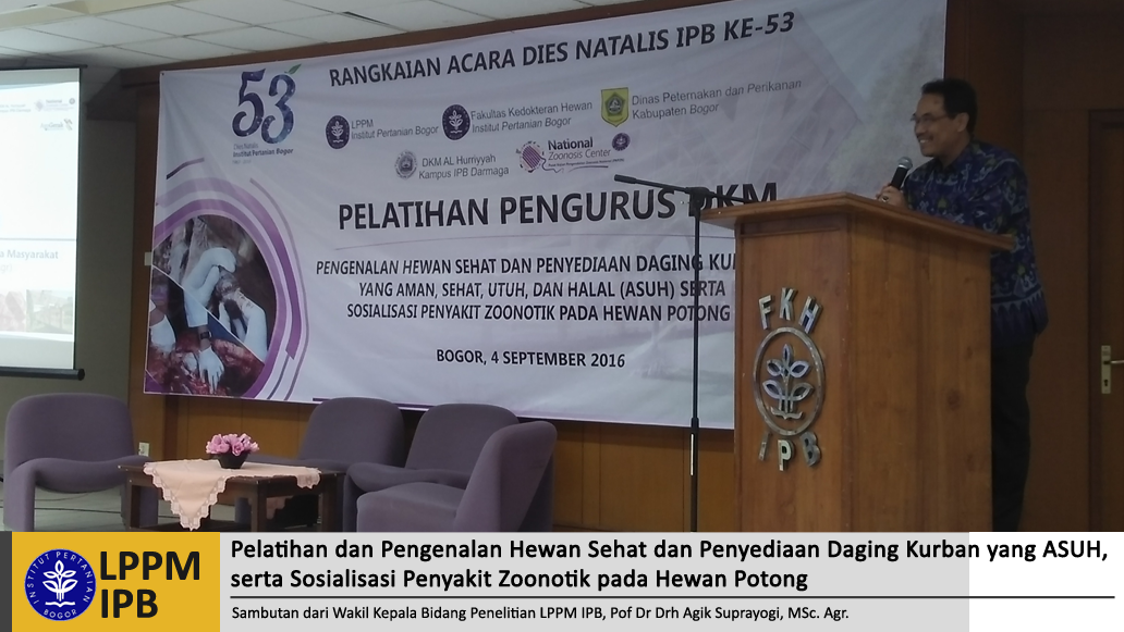Dalam rangka menyambut Hari Raya Idul Adha 1437 H, sekaligus sebagai rangkaian acara Dies Natalis IPB ke-53, Lembaga Penelitian dan Pengabdian kepada Masyarakat (LPPM) Institut Pertanian Bogor (IPB) bekerja sama dengan Fakultas Kedokteran Hewan (FKH) dan Dewan Kemakmuran Mesjid (DKM) Al-Hurriyyah mengadakan kegiatan “Pelatihan dan Pengenalan Hewan Sehat dan Penyediaan Daging Kurban yang ASUH, Serta Sosialisasi Penyakit Zoonotik pada Hewan Potong”, pada hari Minggu, tanggal 4 September 2016, di Sekretariat FKH IPB.
