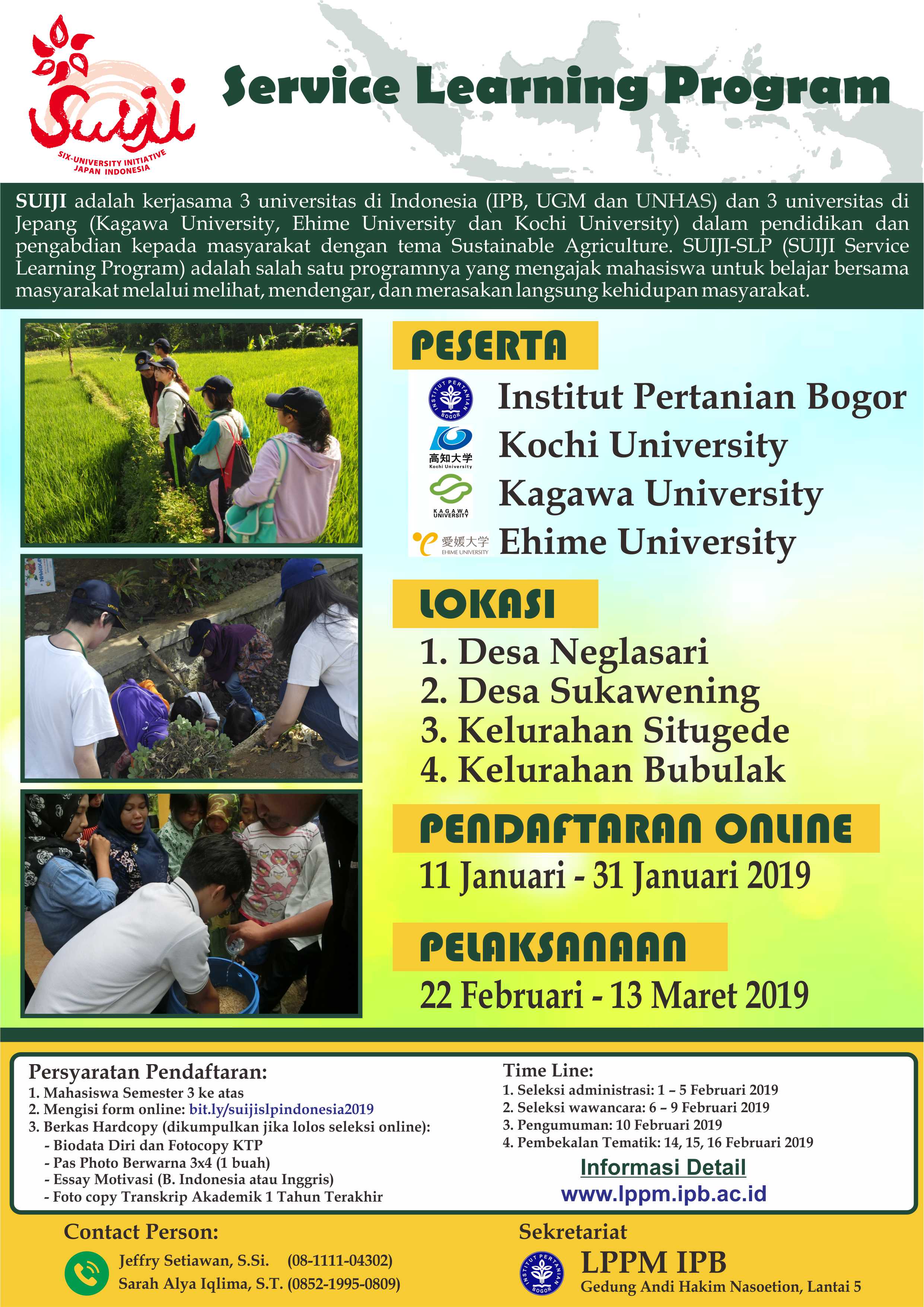 Setelah berhasilnya program SUIJI-SLP Tahun 2018, maka kami mengajak mahasiswa IPB untuk dapat turut serta dalam kegiatan SUIJI-SLP Indonesia Tahun 2019 yang akan diselenggarakan pada Tanggal 22 Feb – 13 Maret 2019. Daftarkan dirimu segera dan jangan sampai kehilangan kesempatan untuk mendapatkan pengalaman yang berharga!!!