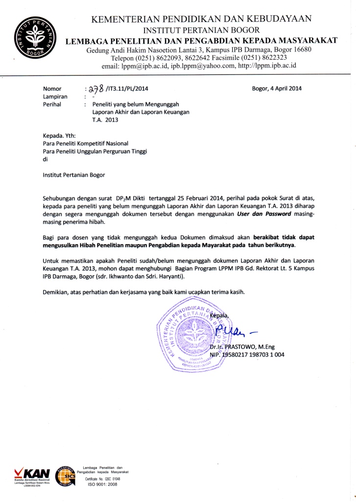 Kepada. Yth: Para Peneliti Kompetitif Nasional Institut Pertanian Bogor Sehubungan dengan surat DP2M Dikti tertanggal 25 Februari 2014, perihal pada pokok Surat di atas, kepada para peneliti yang belum mengunggah Laporan Akhir dan Laporan Keuangan T.A. 2013 diharap dengan segera mengunggah dokumen tersebut dengan menggunakan User dan Password masing-masing penerima hibah. Bagi para dosen yang tidak mengunggah kedua Dokumen dimaksud akan berakibat tidak dapat mengusulkan Hibah Penelitian maupun Pengabdian kepada Mayarakat pada tahun berikutnya. Untuk memastikan apakah Peneliti sudah/belum mengunggah dokumen Laporan Akhir dan Laporan Keuangan T.A. 2013, mohon dapat menghubungi Bagian Program LPPM IPB Gd. Rektorat Lt. 5 Kampus IPB Darmaga, Bogor. Demikian, atas perhatian dan kerjasama yang baik kami ucapkan terima kasih. a.n. Kepala, TTD Prof.Dr.Drh. Agik Suprayogi, M.Sc,AIF Download : |