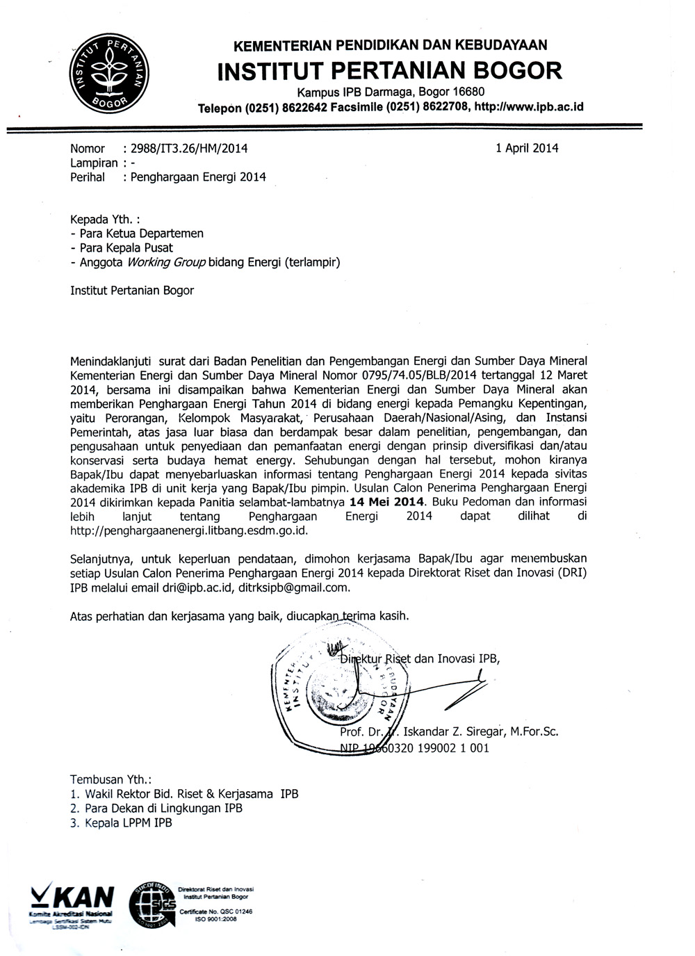 Selanjutnya, untuk keperluan pendataan, dimohon kerjasama Bapak/Ibu agar menembuskan setiap Usulan calon Penerima Penghargaan Energi 2014 kepada Direktorat Riset (DRI) IPB melalui email dri@ipb.ac.id, ditrksipb@gmail.com