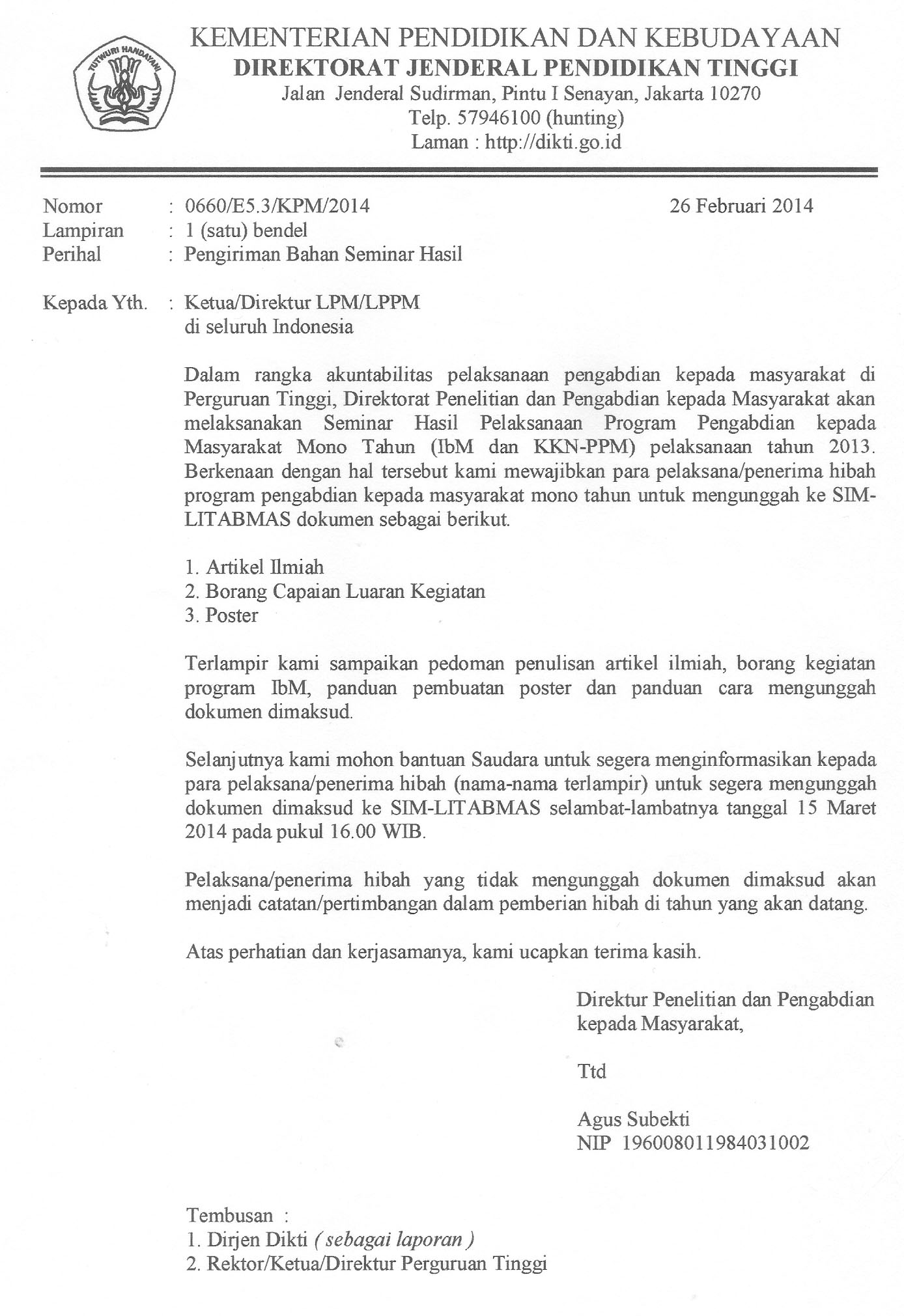 Dokumen yang dimaksud agar dapat diunggah ke SIM-LITABMAS selambat-lambatnya tanggal 15 Maret 2014 pukul 16.00 WIB.