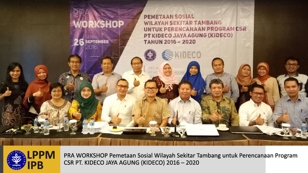Senin, 26 September 2016 terselenggara PRA WORKSHOP Pemetaan Sosial Wilayah Sekitar Tambang untuk Perencanaan Program CSR PT. KIDECO JAYA AGUNG (KIDECO) 2016 – 2020 kerjasama antara LPPM IPB – PT. KIDECO JAYA AGUNG (KIDECO) di IPB International Convention Center, Bogor. LPPM merupakan suatu Lembaga Penelitian dan Pengabdian kepada Masyarakat di lingkungan Institut Pertanian Bogor, yang memiliki pengetahuan dan kemampuan dalam melaksanakan Program Kegiatan Pemetaan Sosial di wilayah operasional PT. KIDECO JAYA AGUNG. Perwakilan dari LPPM yang hadir pada kegiatan ini adalah Dr. Ir. Agus Oman Sudrajat, M.Sc., selaku sekretaris LPPM IPB.