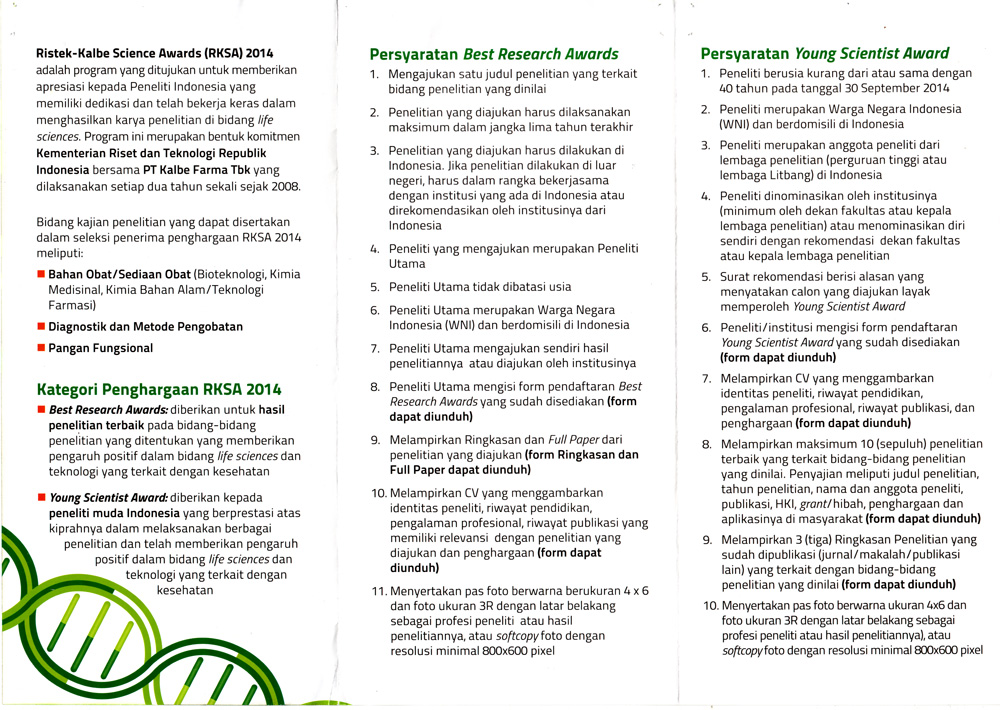 Menindaklanjuti surat dari PT. Tempo Inti Media Tbk Nomor 028/SK-MRCM/II/14 tertanggal 17 Februari 2014, bersama ini disampaikan bahwa Kementerian Riset dan Teknologi RI dan PT. Kalbe Farma Tbk kembali menyelenggarakan Ristek-Kalbe Science Awards (RKSA) 2014. Sehubungan dengan hal tersebut, mohon kiranya Bapak/Ibu dapat menyebarluaskan informasi mengenai Ristek-Kalbe Science Awards 2014 kepada civitas akademika IPB di unit kerja yang Bapak/Ibu pimpin. Pendaftaran usulan calon penerima Ristek-Kalbe Science Awards 2014 dan pengumpulan berkas dapat dikirimkan kepada panitia paling lambat 26 Juni 2014. Untuk mengetahui informasi lebih lengkap tentang syarat dan ketentuan, Bapak/Ibu dapat membuka website: www.kalbescienceawards.com, www.ristek.go.id atau website kami http://dri.ipb.ac.id.