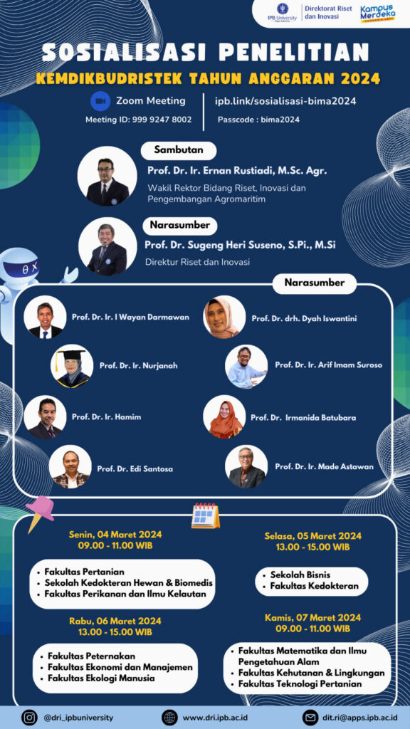 Sehubungan telah dibukanya penerimaan proposal penelitian pendanaan Kementerian Pendidikan, Kebudayaan, Riset dan Teknologi dan dalam rangka meningkatkan atmosfer penelitian di Institut Pertanian Bogor, bersama ini kami mengundang Bapak dan Ibu dosen peneliti dalam acara “Sosialisasi Penelitian Kemendikbudristek Tahun Anggaran 2024” yang akan dilaksanakan pada: